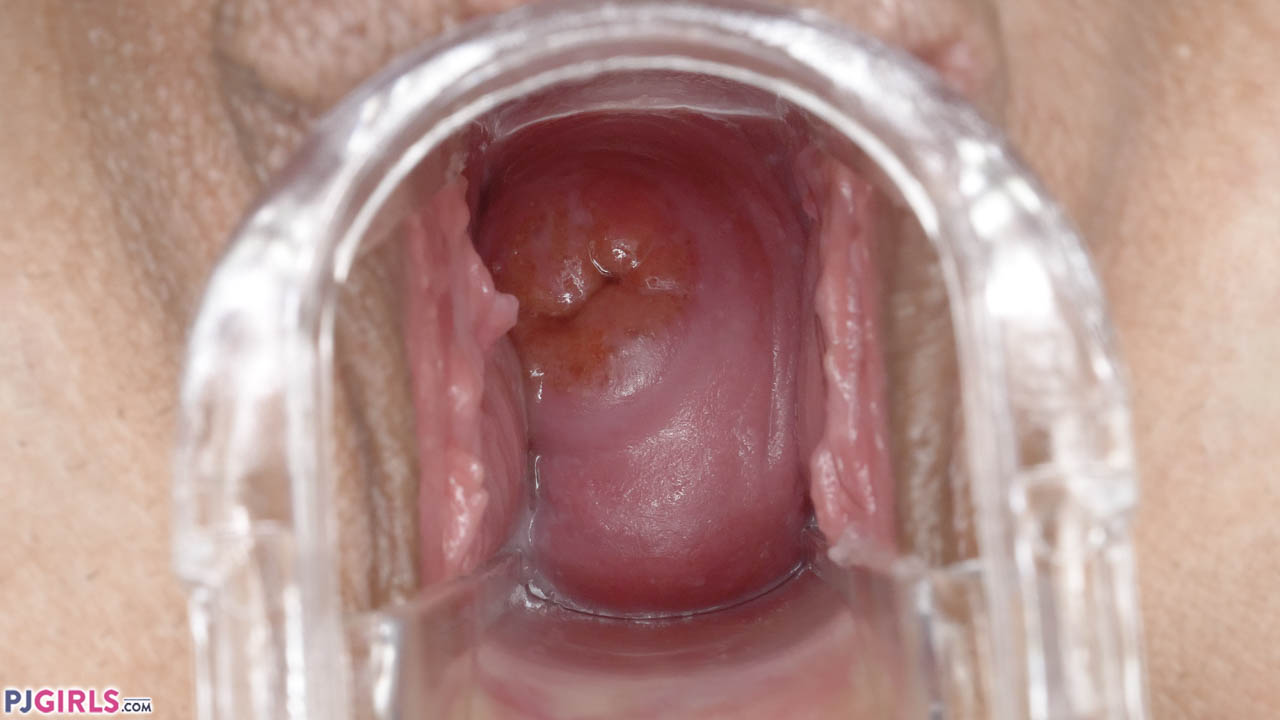 Nicole reclines wearing white stockings, a white sparkling bustier AND a speculum inside hew sweet pussy. As she squeezes her boobs, her clit is already erect, peeking down from the top of the speculum. as she rubs her clit, the speculum moves from side to side showing her glistening cunt walls and her glowing cervix deep within. Deciding that simple masturbation is insufficient for her needs, the wand vibrator is applied, quickly bringing her to a pulsing orgasm. The close up view into her pussy is just sublime, showing every glistening detail of her rippled walls and the rosy entrance to her womb. Watching this, as Nicole once more brings herself to an orgasm with the wand is simply delicious.