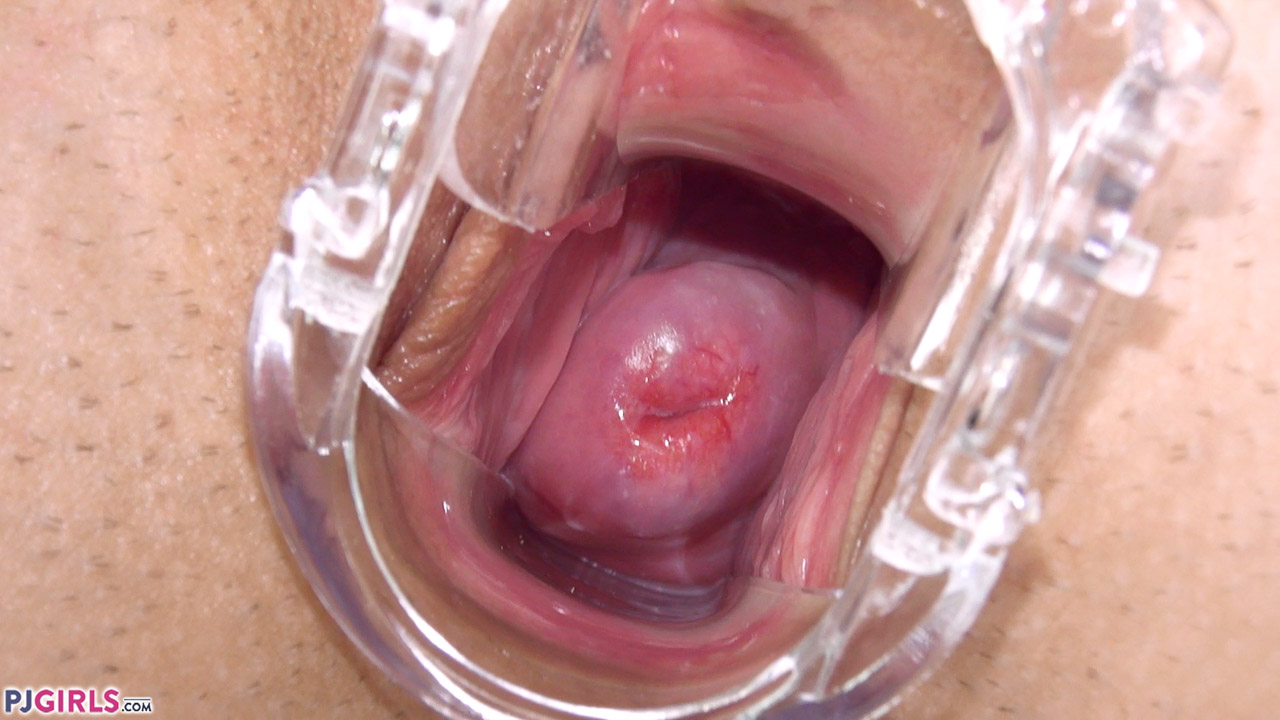 Having studied the cave walls, we are now taken deeper within as Amy opens wide with a speculum. Her cervix is without doubt one of the clearest we've seen and smiles at us gleefully from the first peek. Closer and closer we go until at 23 mins her lovely cervix almost fills the screen. it does deserve centre stage, but is still framed by her lovely pink walls. These are shown in particular clarity as Amy withdraws the speculum to allow us to focus on her lovely smile and grey eyes (plus boobs of course).
