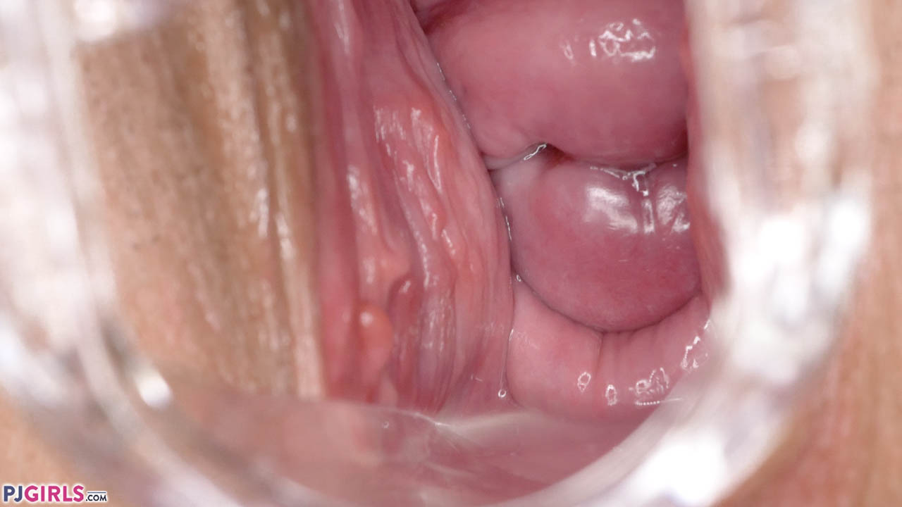 From the title alone, you know this is going to be a great video! Opening naked as the day she was born, Ria teases the speculum past her nipples and down her body to her pussy, where it becomes planted for the remainder of the video. Initially just letting us admire her pretty cervix, Ria soon finds a better use for the speculum - moving it in and out of her lovely pussy as a dildo. As the arms of the speculum work in and out of her cunt, her cervix rises and falls in sympathy and her walls flex in and out, showing every delicious ripple. Ria's cervical entrance is wide - giving a great view as the speculum presses deep. The side views of Ria's walls are also quite spectacular! This is possibly one of the clearest videos of a cervix yawning open that we've seen. Top marks for both Ria and Jiri. For the final section of the video, Ria moves to her knees, letting us see inside from between her ass cheeks. As she flexes her vaginal muscles, the view of her walls and her cervix is almost as amazing as the front views above. Altogether - a superb video!