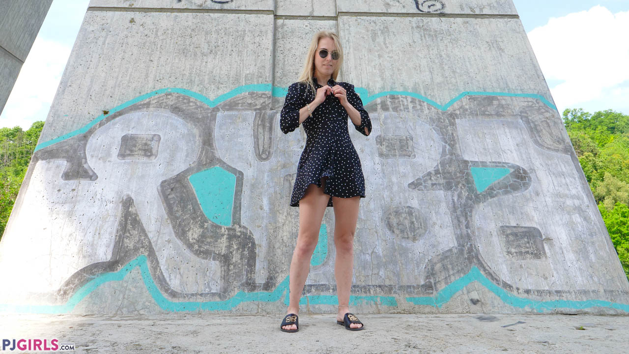 When our models pose under the bridge, they normally do so with a degree of candour, lifting skirts and maybe temporarily lowering their tops. Not Caroline though! It takes just one minute for her to strip completely naked for us and then to begin a superb show of holding wide her cunt, first from the back and then, letting us also enjoy her tiny titties, from the front view. Caroline's pussy gapes easily, her rippled walls coming clearly into focus as she pulls her labia wide apart. Despite challenging outdoor lighting conditions, Jiri maintains a clear focus, showing all of Caroline's yummy bits in clear detail.