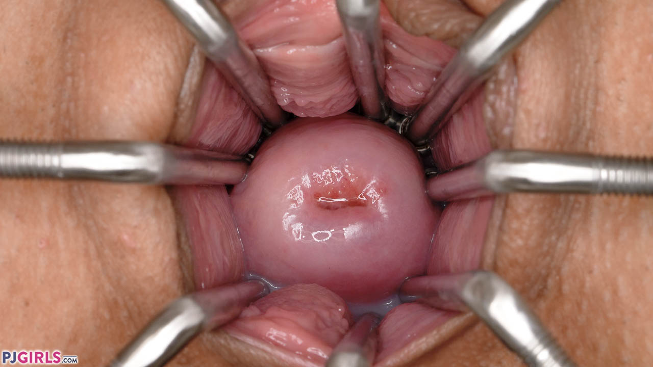 Silvia IS special - a beautiful brunette, with large breasts, crested by rich, dark areola. She starts the video leaning backwards and flexing her pussy lips in and out to give a great view of her rippled cunt entrance. For a special girl, we need a special toy - and that's just what's provided after 8 mins. An 8 armed retractable clamp is inserted deep into Silvia's waiting pussy and then wound open to give a truly unfettered view of her cervix and pussy walls. This looks good from a distance, but oh boy does it look BETTER close up. At around 11 1/2 mins, Jiri zooms in so that the perfect round (OK, octagon strictly speaking) of Silvia's open cunt fills your screen. You get to study every section of her walls all at once, with her cervix rising in the centre of the metal arms in unblemished glory. The close ups of Silvia's walls and indeed her cervix are just stunning. This might not be as straightforward to insert and adjust as a speculum - but the results are worth it. You even get a bit of girl goo gathering along the lower walls of Silvia's puss for good measure - obviously, she likes it too!