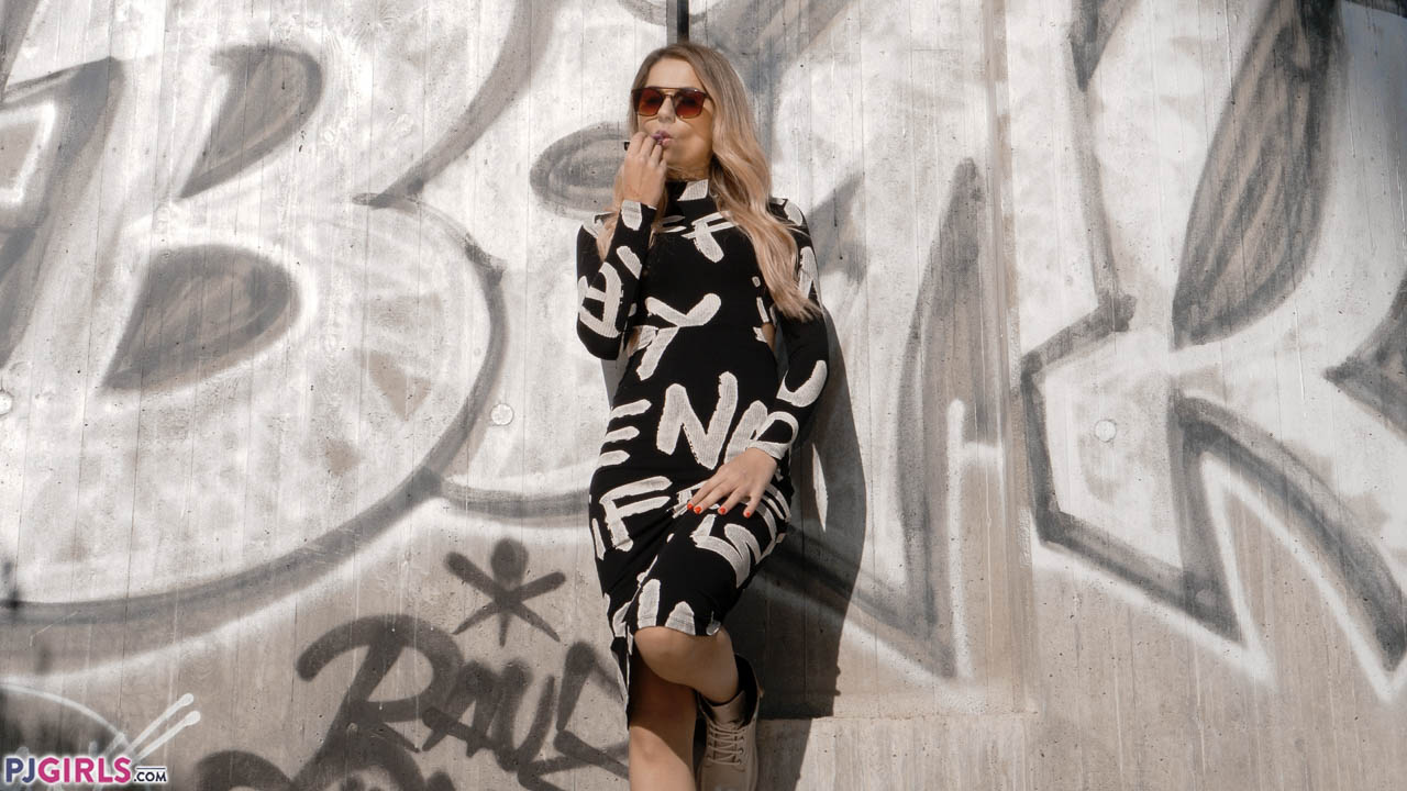 Vanessa Leone is one of our new fuck toys. She has some fine assets that we have been greeted with a couple of times. After two previous recordings, she now has the basics down. Wearing no panties, she lifts up her dress and displays the goods. She does a good job of getting her pink pussy out for us to gawk at.