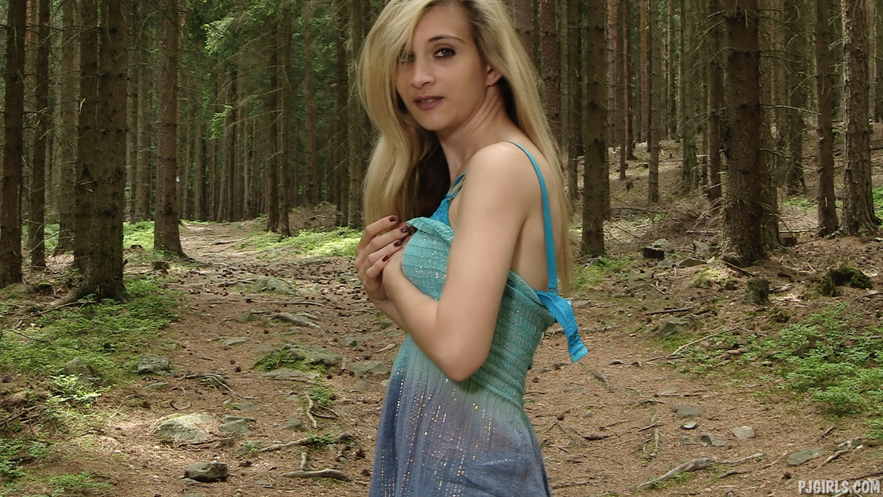 Pretty girl with a perfect pussy. No toys to block the view; just a wide open pussy to admire. I was hoping with her pee hole being front and center in the woods in a close-up spread shot would have a pee shot or two. Still, no complains; the view is great.