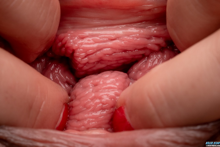 Our apologies that the spreading action is slightly limited and a smaller dildo had to be used. The video was shot first and as a result Billie's pussy has become swollen.
