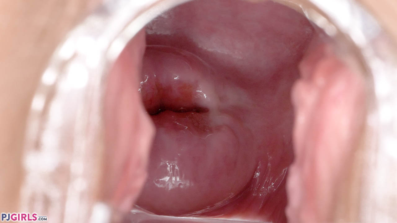 From the title alone, you know this is going to be a great video! Opening naked as the day she was born, Ria teases the speculum past her nipples and down her body to her pussy, where it becomes planted for the remainder of the video. Initially just letting us admire her pretty cervix, Ria soon finds a better use for the speculum - moving it in and out of her lovely pussy as a dildo. As the arms of the speculum work in and out of her cunt, her cervix rises and falls in sympathy and her walls flex in and out, showing every delicious ripple. Ria's cervical entrance is wide - giving a great view as the speculum presses deep. The side views of Ria's walls are also quite spectacular! This is possibly one of the clearest videos of a cervix yawning open that we've seen. Top marks for both Ria and Jiri. For the final section of the video, Ria moves to her knees, letting us see inside from between her ass cheeks. As she flexes her vaginal muscles, the view of her walls and her cervix is almost as amazing as the front views above. Altogether - a superb video!