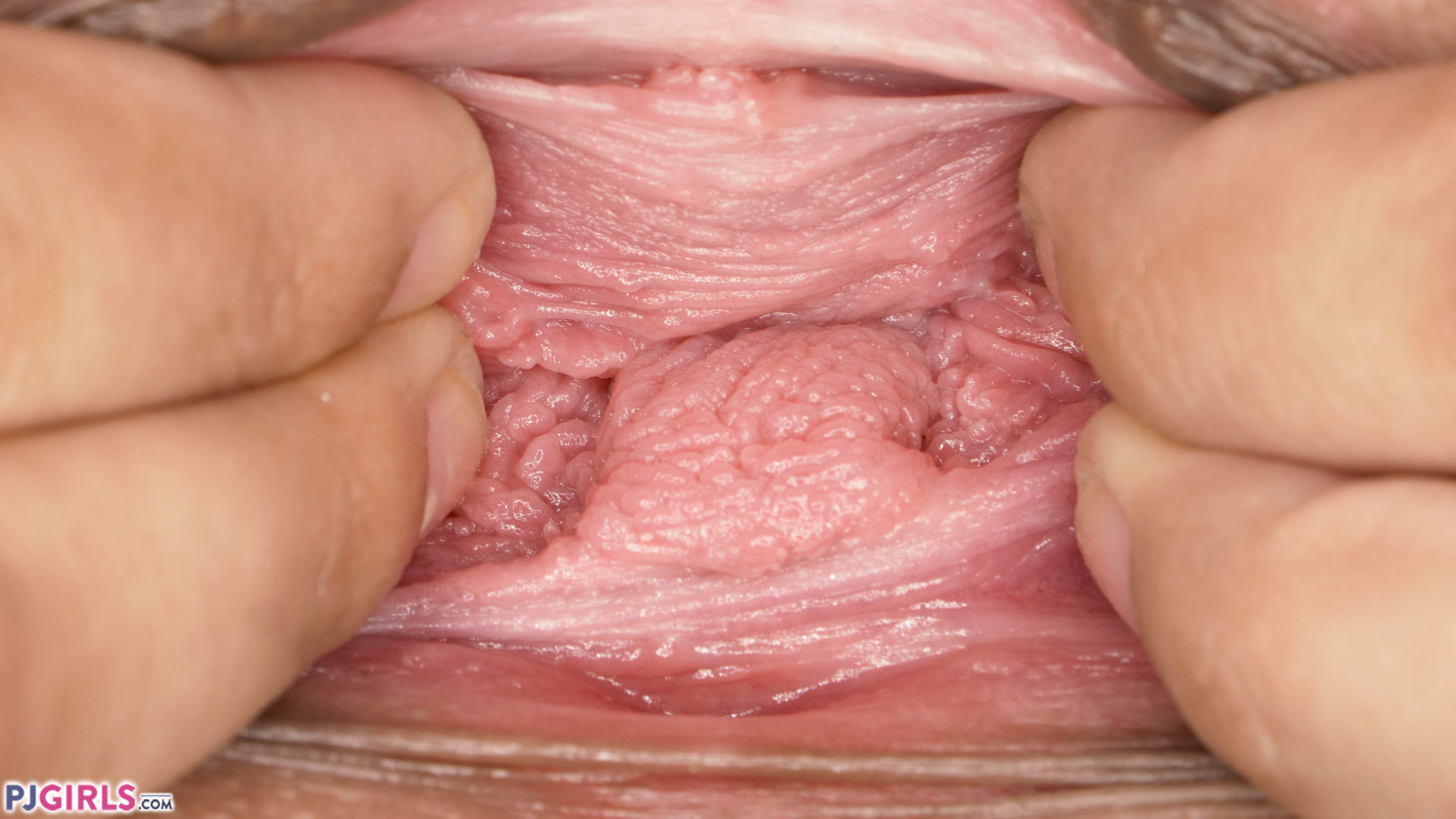 As we've mentioned before, young Acabella has an impressive gape for a girl only 19 years old. When she pulls apart her labia, the way her fotzenloch opens up is a sight to behold, and you can really appreciate the beauty of her vaginal corona. The thigh cuffs help open her up even more, but then when she sticks four fingers inside and pulls herself open, she displays all that beautiful pink cunt meat for us to stare at