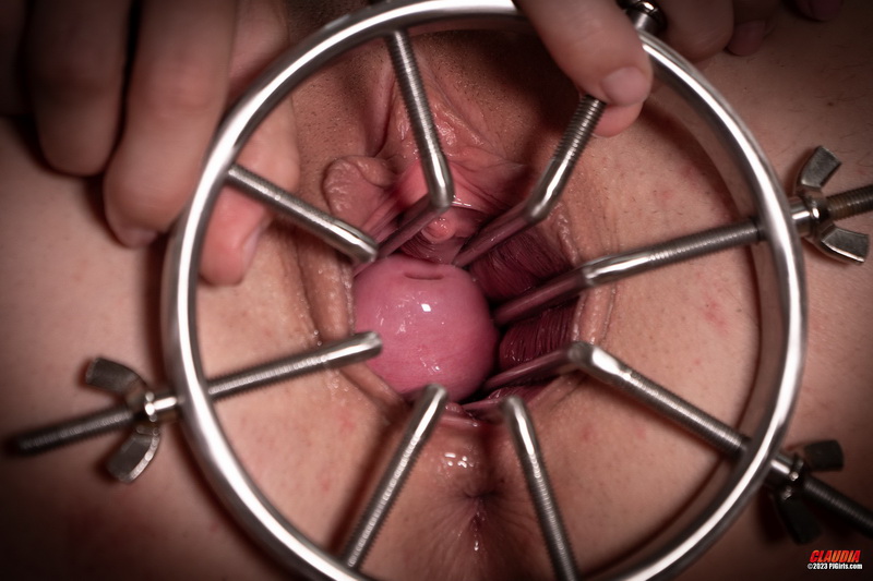 What a spectacular speculum! And what a stunning CUNT show!! The contrast between Claudia's soft wet pink CUNTmeat and the shiny, hard invasive metal could hardly be more exciting: I wish every PJGirl would agree to open her CUNT wide with this delicious instrument. (It also works well as an anal opener, but maybe that's for another niche porn site ...) Thank you, Claudia, for always pushing the boundaries of CUNTspreading!!
