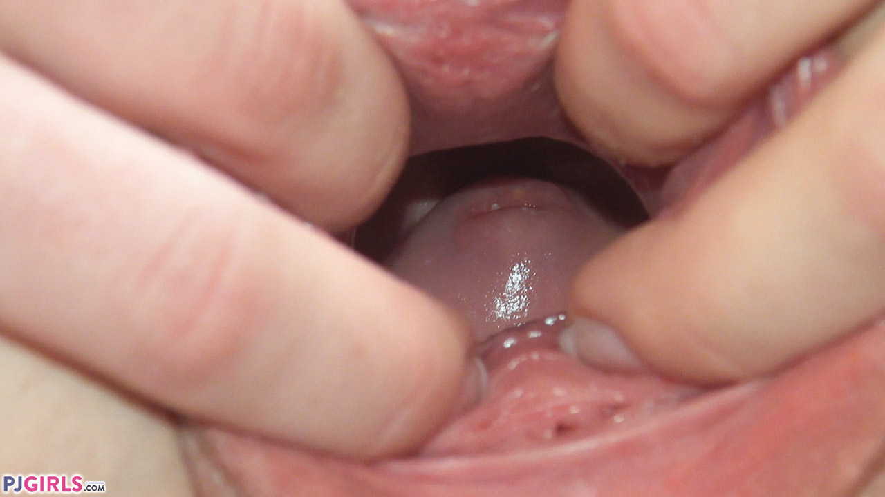 Not to be limited to the front view, Jessica and friend turn around for some rear splaying and playing. As 3 hands move to 4, the gap gets wider and the focus even closer, until we are able to gaze lovingly into Jessica’s inner depths, with her cervix emerging from the shadows to join the show.