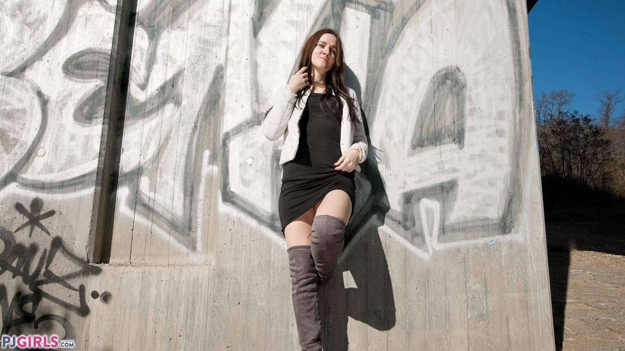 I just love this kind of set! Outdoors, a hot brunette lady dressed to kill that is not shy to have pictures taken PJGirls-style. Trisha is looking fantastic!